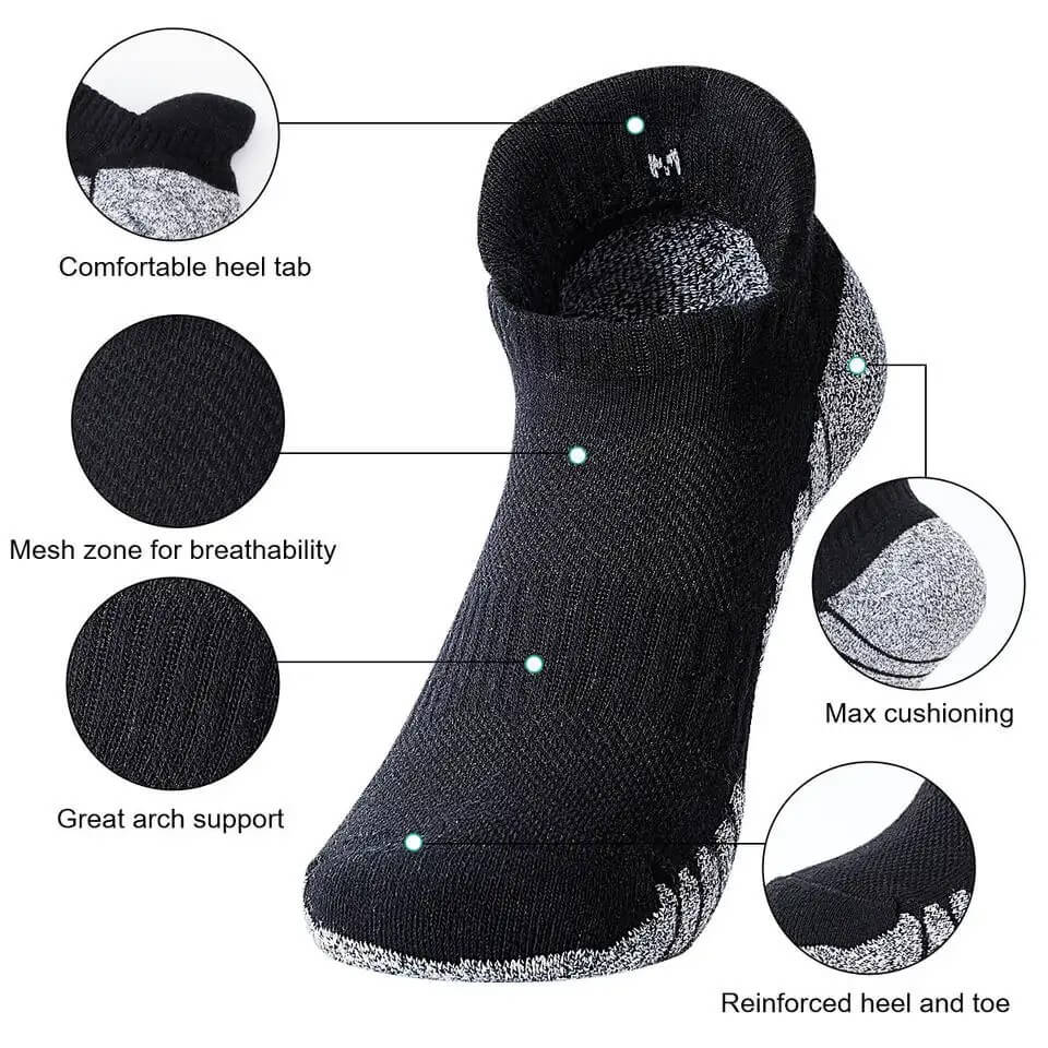 - Friction & Shock Protection Cushioned Socks – These Low ankle socks add additional durability and comfort in high wear areas, reduce friction and blisters, prevent holes, and extend service life. Thick heel tab on socks will protect your feet and make you feel comfortable after working out.